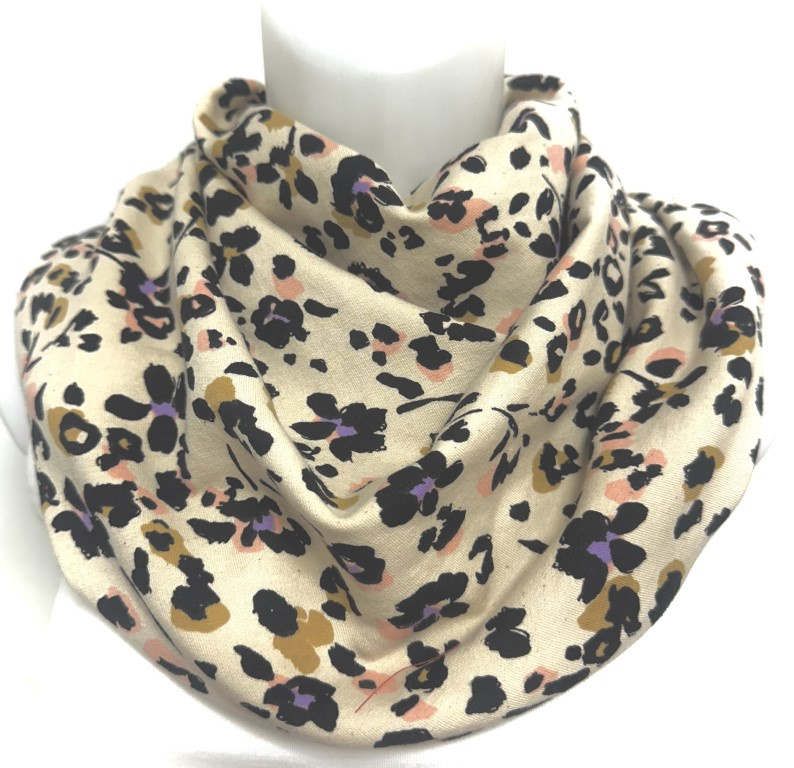 Leuk lentesjaal voor meiden. Offwhite basiskleur met zwarte bloemen met accenten van paars, olijfgroen en roze.  Combineert makkelijk met velen kleuren